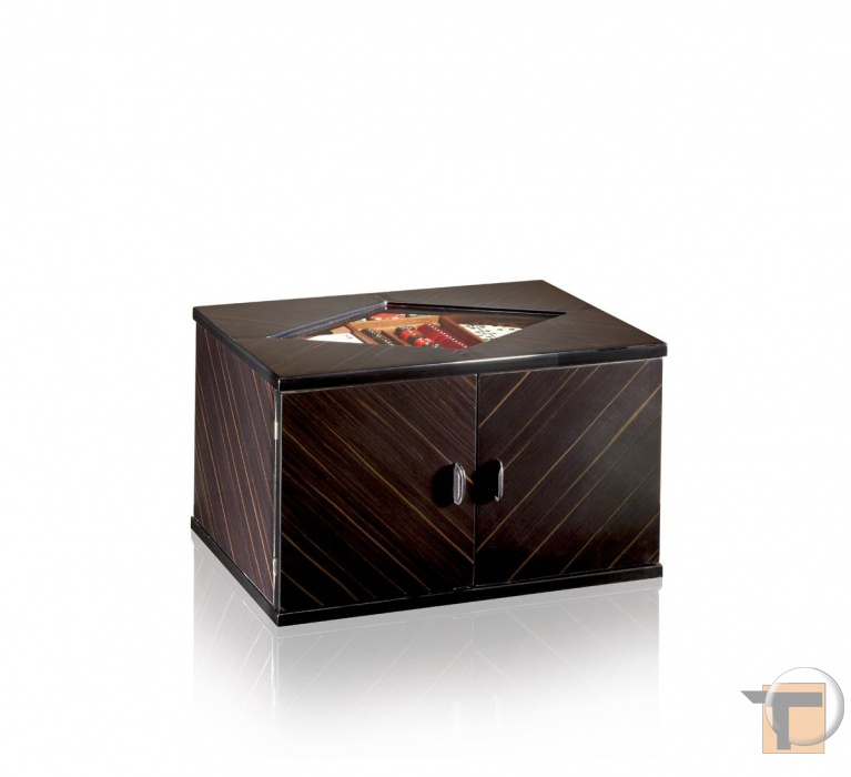 Набор выполнен из полированного эбенового дерева с отделкой никелем, ручки из натуральной кожи, на крышке шкатулки сверху хрустальное стекло.