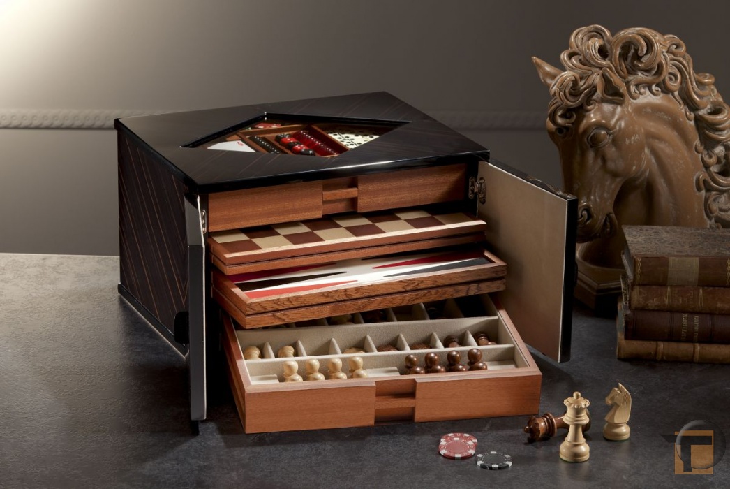 Игральный набор NOTTE DI GIOCHI - настоящий шедевр, который переносит Вас в игральные залы Лас-Вегаса! В наборе: шахматы, шашки, нарды, домино, кости, игральные карты и 170 фишек для покера.