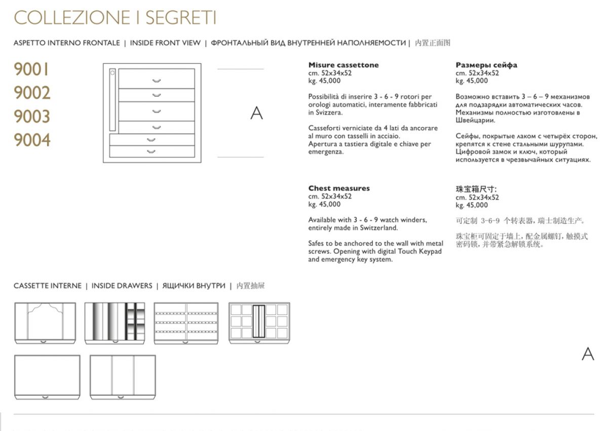 Сейф Nero Segreto чёрного цвета имеет безупречный дизайн для идеального хранения драгоценностей. Сейф можно установить в уже существующей мебели и прикрепить к стене. Аксессуары изготовлены из латуни, покрытой тонким слоем 24-каратного золота.