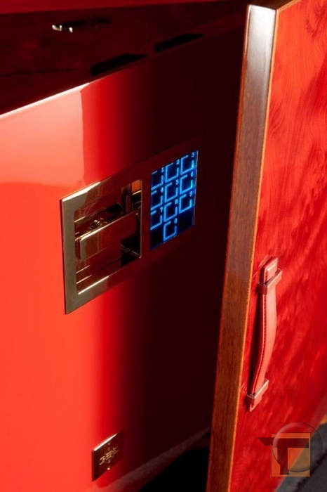 Особенный, безупречный, современный сейф IL FORZIERE ROSSO, встроенный в шкаф. Новый электронный замок позволяет Вам иметь доступ к облицованным деревом выдвижным ящичкам с драгоценностями и часами. Сейф выполнен из красной полированной радики.