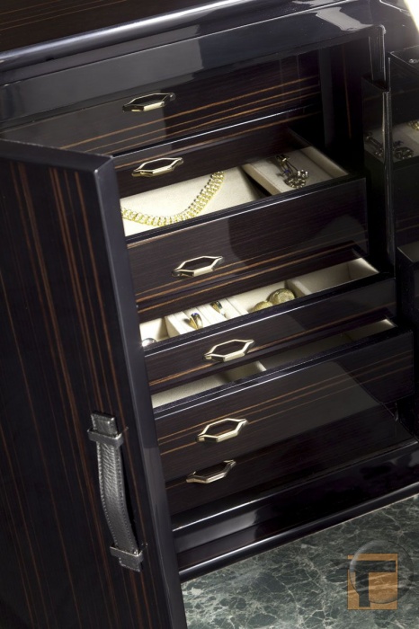 Дизайн этого компактного шкафа-сейфа безупречен и своеобразный. Встроенный сейф содержит внутренние облицованные деревом выдвижные ящики для драгоценностей и часов и запирается на электронный замок.