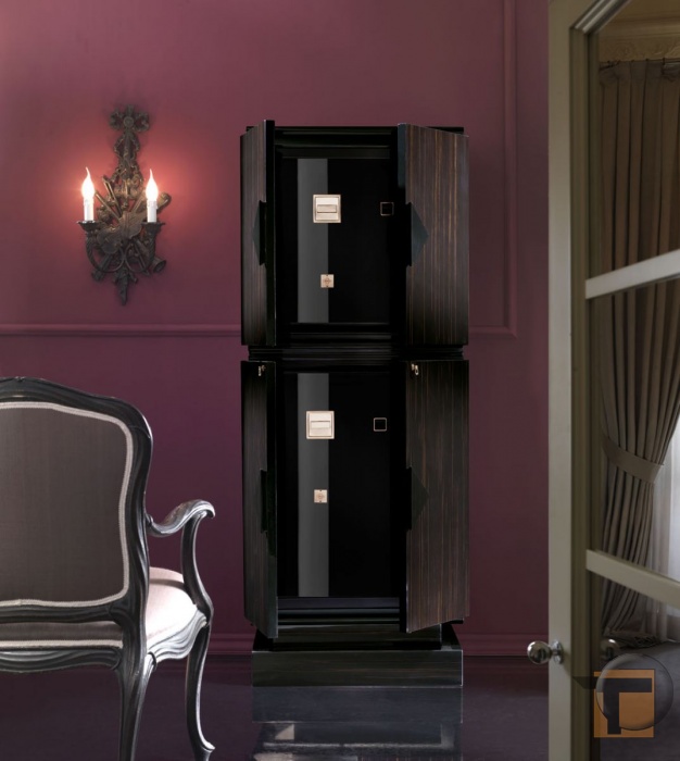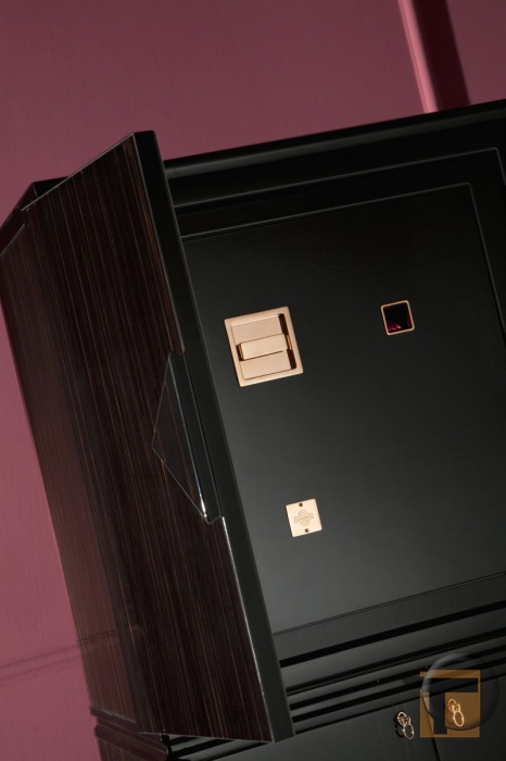 В верхнюю часть шкафа встроен бронированный сейф с шестью выдвижными ящиками. Ручки сейфа покрыты 24-каратным розовым золотом. Биометрический замок обеспечивает доступ к содержимому сейфа по отпечатку пальца.