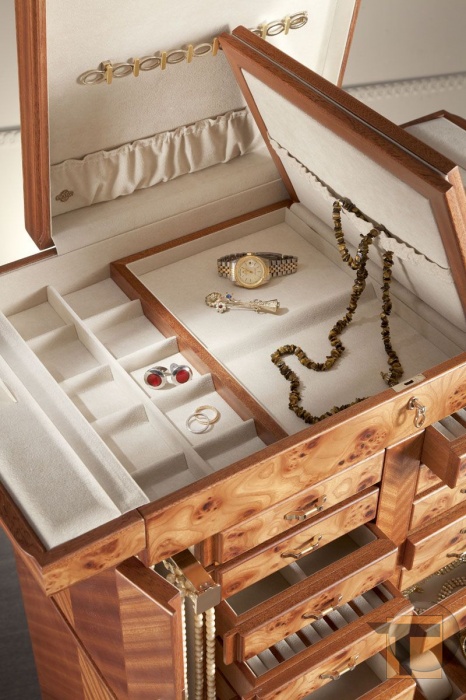В верхней части имеется регулируемое зеркало, держатели для бус и цепочек, отделения для драгоценностей. Верхняя и центральная части закрываются на ключ. Кроме многочисленных ящичков, предназначенных для хранения ваших ценностей, этот шкаф содержит три вместительных ящика для белья в нижней части. Отделка тонким слоем 24-каратного золота.