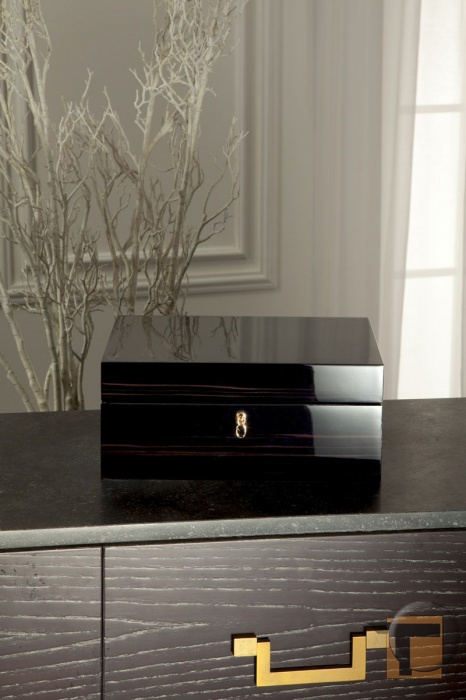 Шкатулка для драгоценностей IL COFANETTO NERO из лакированного эбенового дерева и отделками из 24-каратного золота. На крышке имеется держатель для ожерелий. Шкатулка укомплектована съемным поддоном.